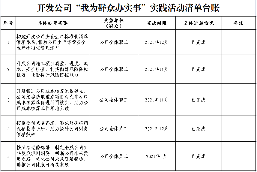 围绕聚焦企业经营发展、安全生产、施工项目、成本核算、财务管理等领域,确定5项办实事任务,建立办实事清单台账,实行动态管理、逐项销号,扎实推进“我为群众办实事”实践活动,切实把好事办好,把实事办实,让群众感受到党组织的温暖和关怀,让群众看到党史学习教育的成果,切实提升群众的获得感、幸福感和安全感。截至目前,QY球友会5项办实事项目已全部完结。